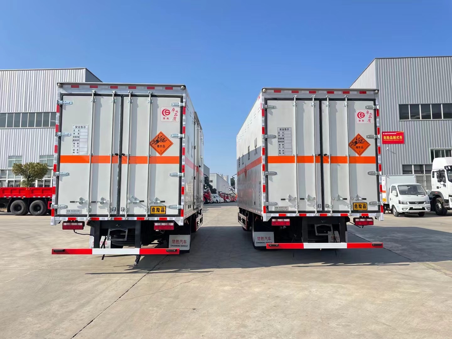 嚴格按照公告尺寸制作。外板采用烤漆板帶百葉窗,內飾為導電性能良好的鋁平板有透氣孔,矩形骨架結構內部填充防火阻燃材料,復合加鉚合工藝。廂體四周鋁合金包邊及包角,車廂底板3mm鋪設防靜電膠皮,廂體前臉50公分高鋪設防靜電膠皮。后部設置對開門,右側單開門,廂體內部兩側安裝捆綁貨物的臥環。廂體內部安裝煙霧報**器及防盜報**感應器。車廂一周粘貼橙色反光帶,箱體粘貼 菱形標志牌,安全告示牌,危險品牌,箱體安裝示廓燈(前白后紅),拖地靜電帶。